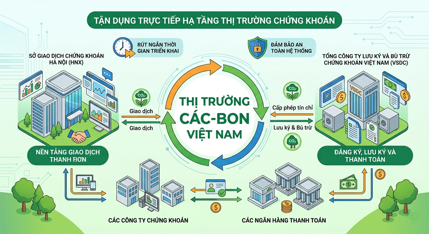 Thị trường các-bon tại Việt Nam đang được xây dựng theo hướng tận dụng trực tiếp hạ tầng của thị trường chứng khoán nhằm rút ngắn thời gian triển khai và đảm bảo an toàn hệ thống. Trong mô hình này, Sở Giao dịch Chứng khoán Hà Nội (HNX) cung cấp nền tảng giao dịch, Tổng công ty Lưu ký và Bù trừ Chứng khoán Việt Nam đảm nhiệm chức năng đăng ký, lưu ký và thanh toán, cùng sự tham gia của các công ty chứng khoán và ngân hàng thanh toán.