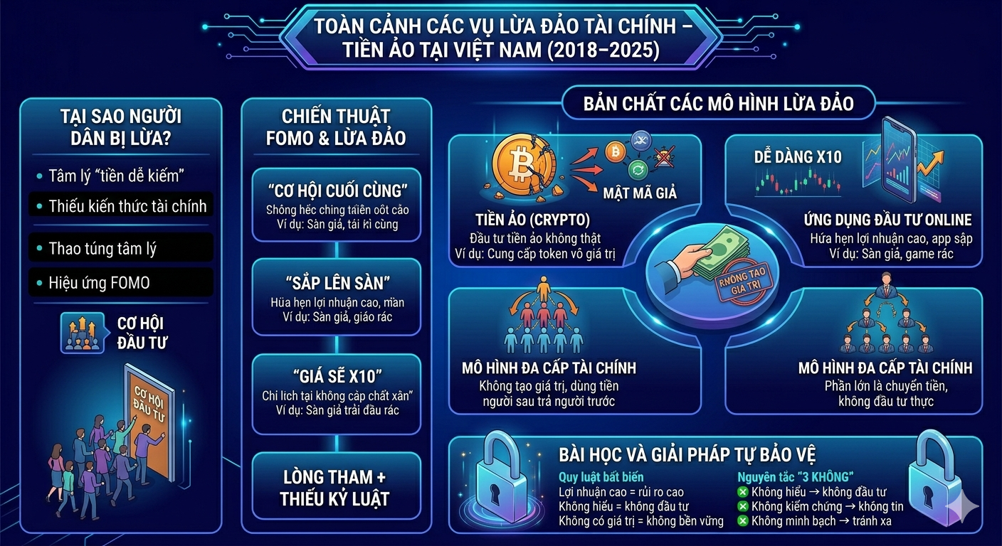 Dưới đây là bài phân tích tổng thể, sâu và có hệ thống về các vụ lừa đảo tài chính – tiền ảo tại Việt Nam trong ~7 năm qua, kèm đánh giá bản chất, nguyên nhân và giải pháp thực tiễn. Bài này được viết như một “kim chỉ nam” cho người dân khi tham gia tài chính.